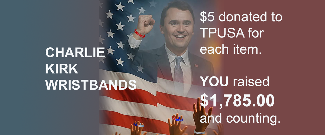 Charlie Kirk Wristbands, $5 goes to TPUSA for each band sold.
